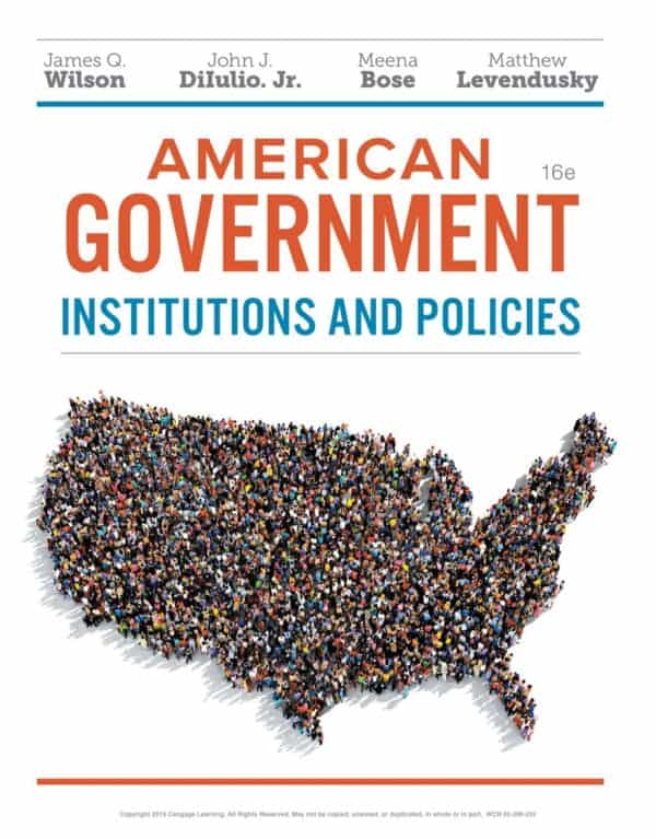 American Government: Institutions and Policies, 16th Edition, (PDF) is a clear and approachable text for students trying to successfully understand the American government. It sets the benchmark for examining current issues in American politics, emphasizing the historical development of governmental procedures and policies, the importance of American governmental institutions, in addition to who governs in the US and to what ends. The 16e includes concise learning objectives, highlighted main concepts, and opportunities for practical application of contemporary debates on policy dynamics. These features allow students to recognize important issues in American politics, maximize comprehension and engage with the material in a meaningful way.